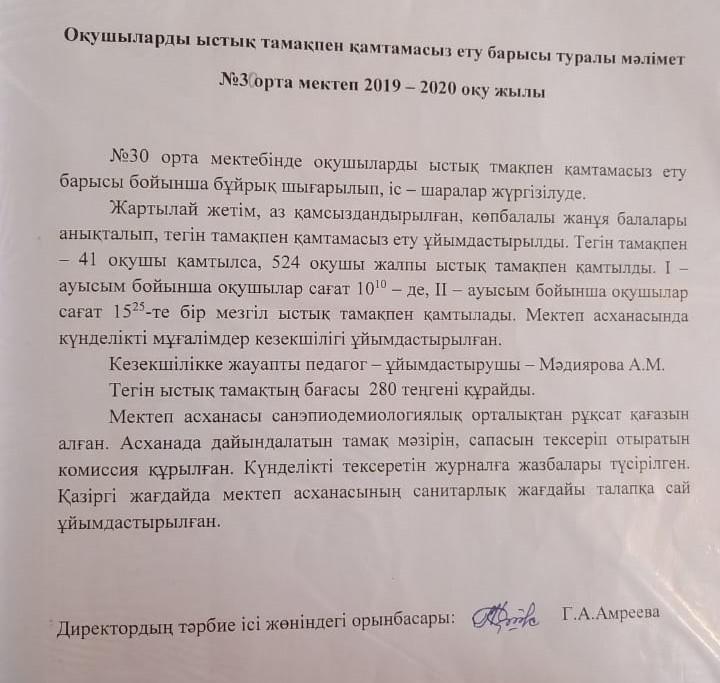Оқушыларды ыстық тамақпен қамтамасыз ету туралы мәлімет » №30 орта мектебі