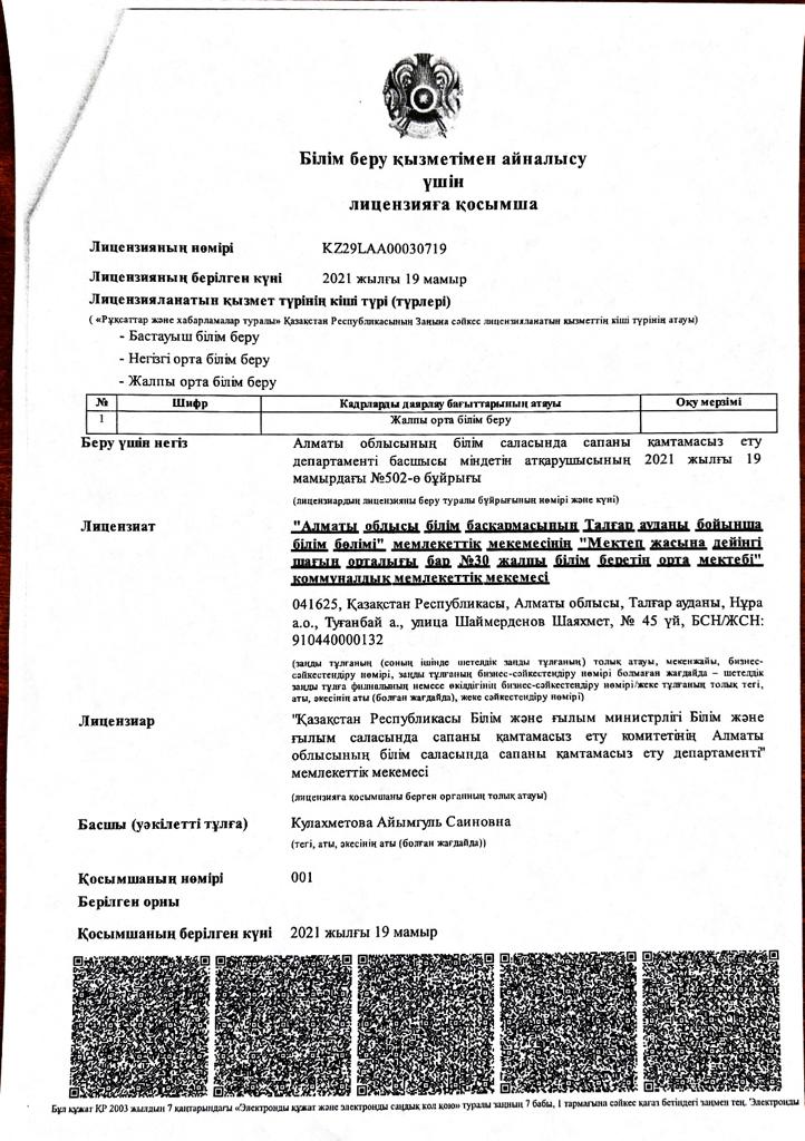 "Алматы облысы білім басқармасының Талғар ауданы бойынша білім бөлімі №30 жалпы білім беретін орта мектебі" КММ